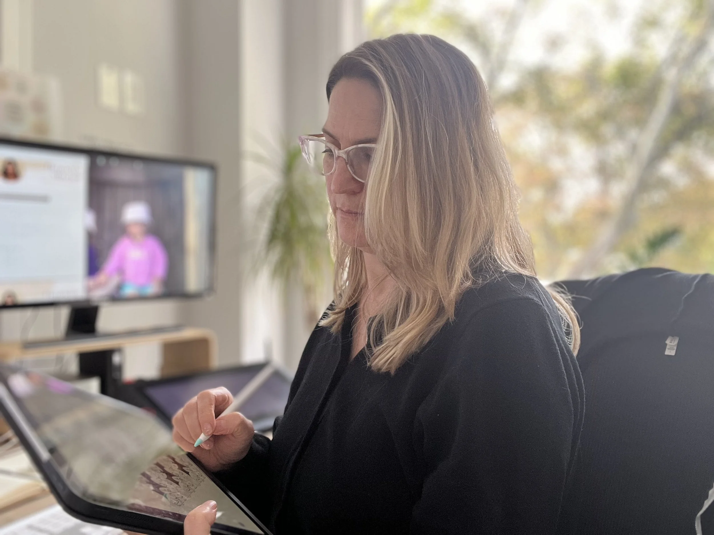 A woman with blonde hair and glasses is sitting at a desk in front of a computer monitor, writing on a digital tablet.